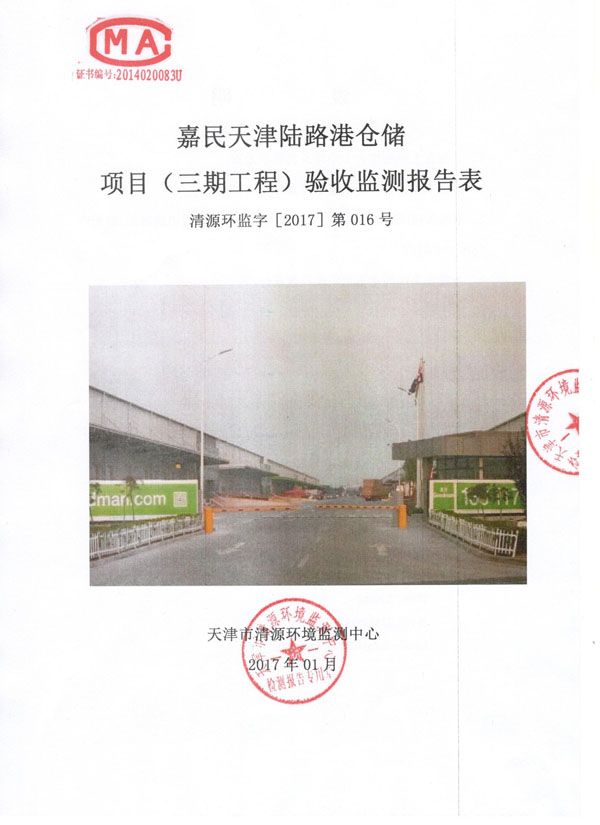 关于《嘉民天津陆路港仓储项目(三期工程)验收监测报告表》的公示