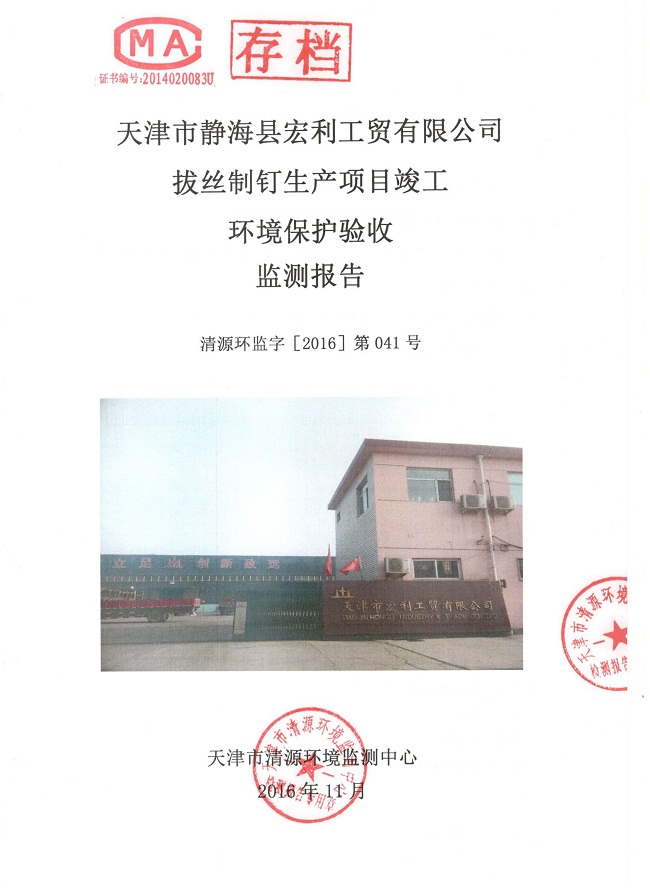 关于《天津市静海县宏利工贸有限公司拔丝制钉生产项目竣工环境保护验收监测报告》的公示
