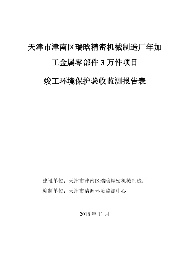 关于天津市津南区瑞晗精密机械制造厂年加工金属零部件3万件项目竣工环境保护验收监测报告表的公示