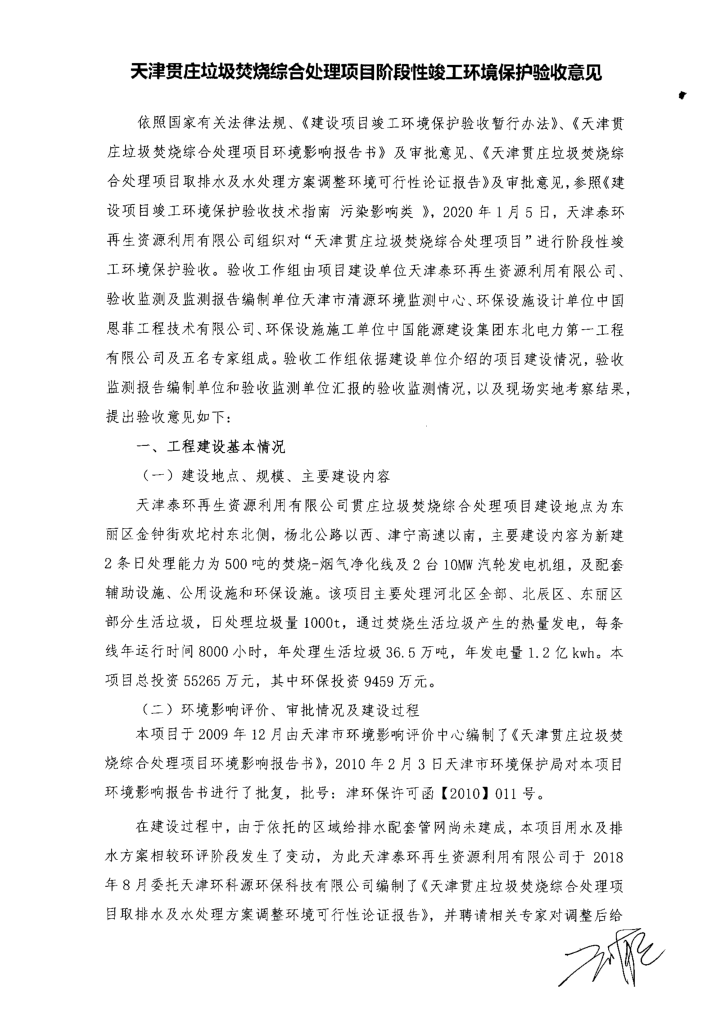 关于天津贯庄垃圾焚烧综合处理项目阶段性竣工环境保护验收意见的公示