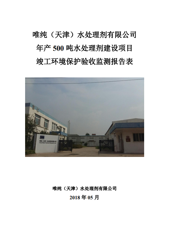 关于唯纯(天津)水处理剂有限公司年产500吨水处理剂建设项目竣工环境保护验收监测报告表的公示