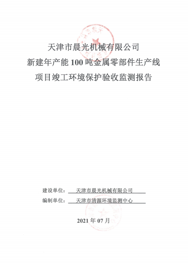 关于天津市晨光机械有限公司新建年产能100吨金属零部件生产线项目竣工环境保护验收监测报告的公示